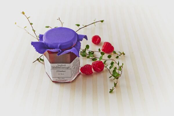 Zutaten: Himbeeren, Zucker, Geliermittel Pektin, Säuerungsmittel: Zitronen- und Sorbinsäure